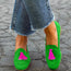 Die Jurcy | Grüne Loafer mit Pinker Fransenapplikation sind für alle gemacht, die ihren Stil selbstbewusst zeigen möchten, ohne auf Komfort zu verzichten. Der leuchtend grüne Farbton und die pinken Fransen schaffen einen verspielten Kontrast, der jedes Outfit frisch, ausdrucksstark und voller Persönlichkeit wirken lässt.